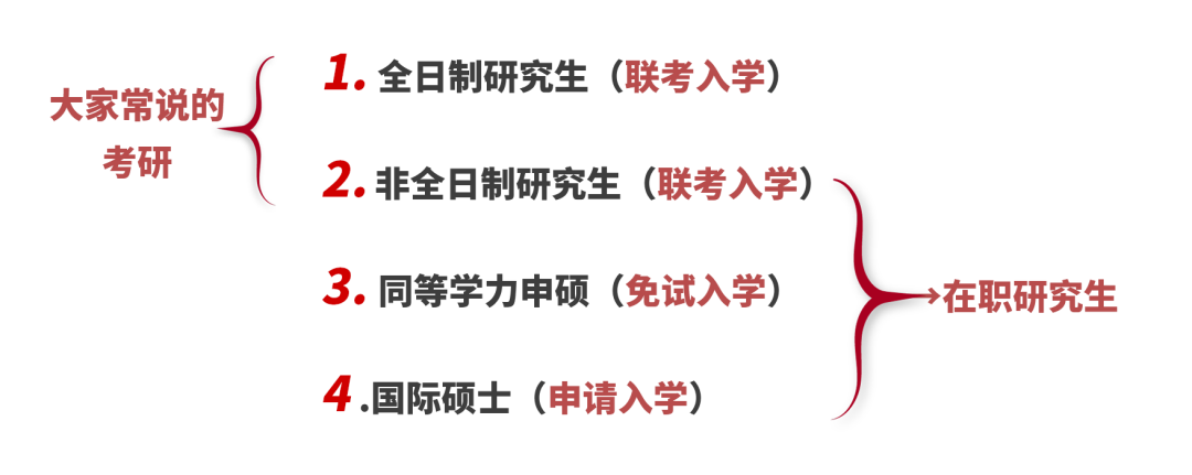 下面,再来说说在职研究生,在职研究生的报考方式不止一种,可以分为非全日制研究生、同等学力申硕和国际硕士等。
