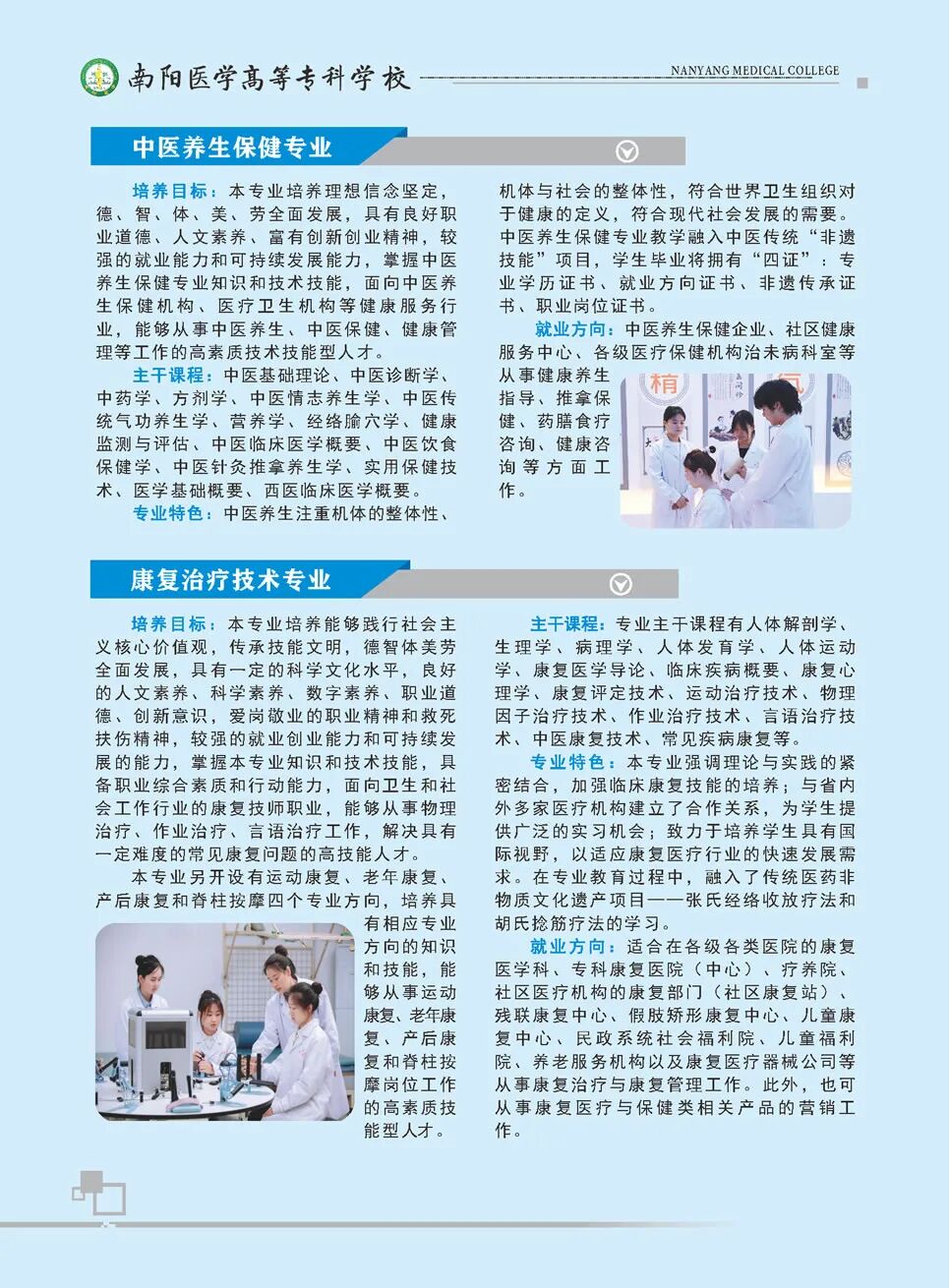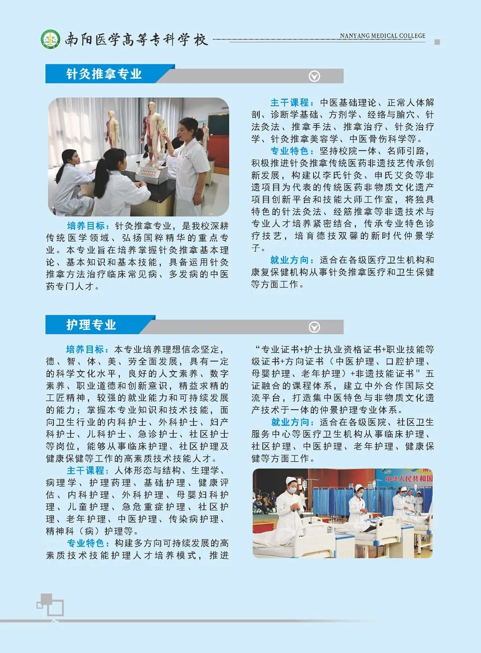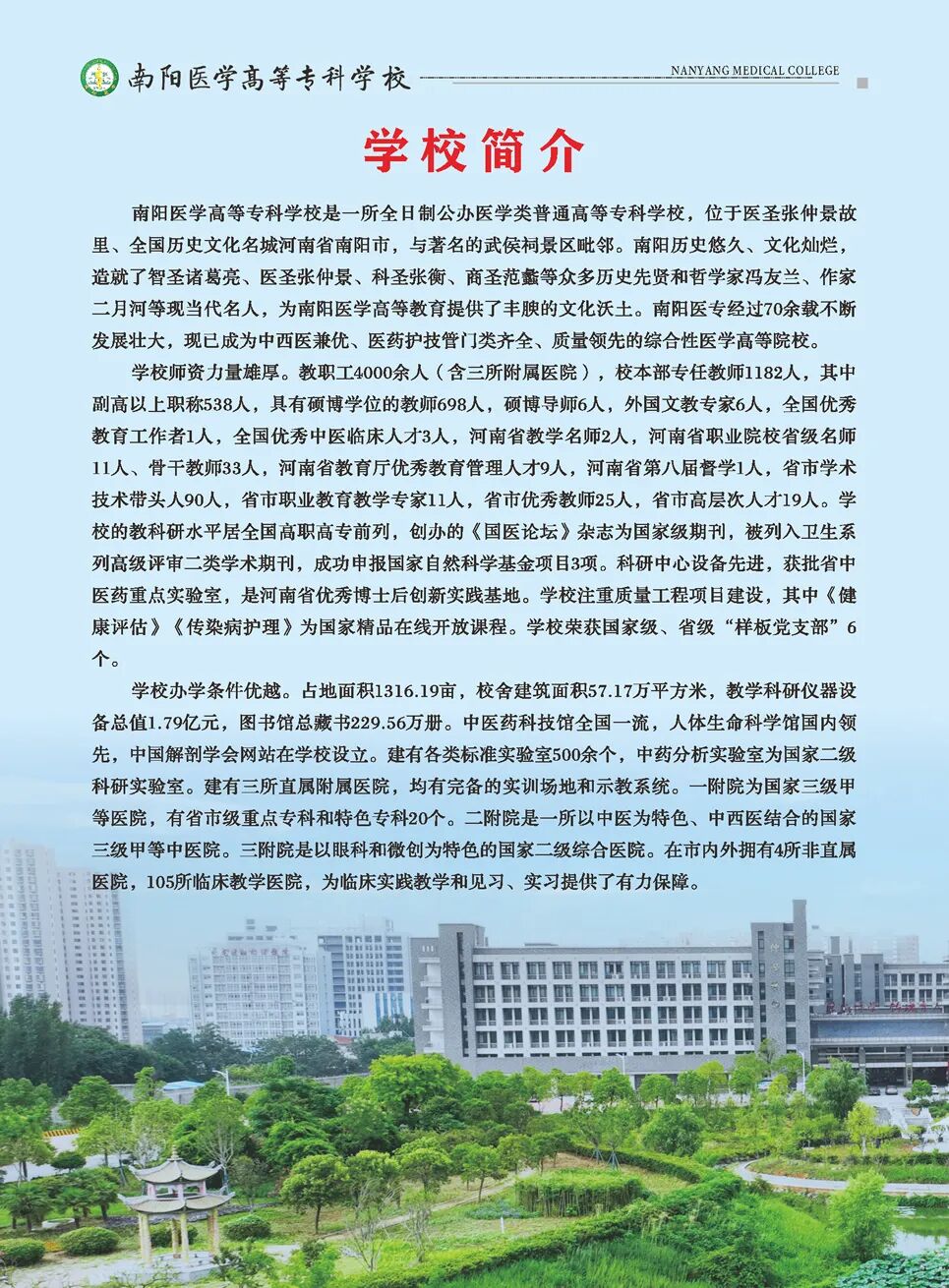 南阳医学高等专科学校简称“南阳医专”,坐落于“中华医圣”张仲景的故里—南阳市,是一所以西医为主体、中医为特色、中西合璧、优势互补的省属全日制医学类普通高等专科学校。