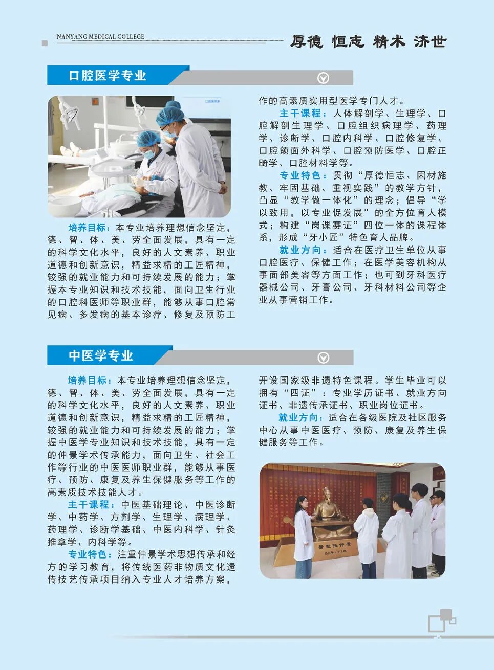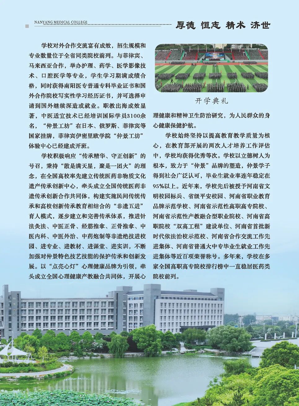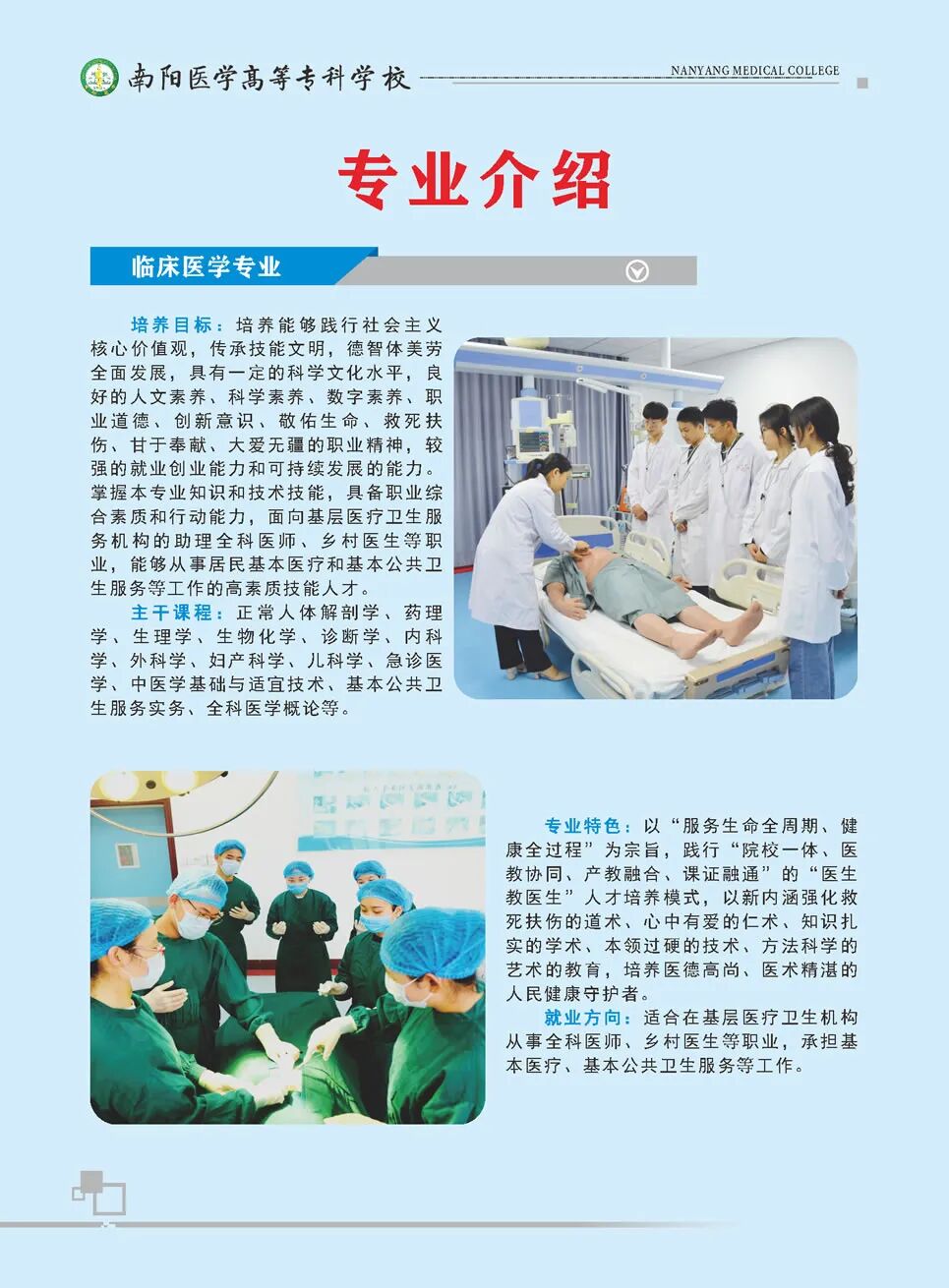 南阳医学高等专科学校简称“南阳医专”,坐落于“中华医圣”张仲景的故里—南阳市,是一所以西医为主体、中医为特色、中西合璧、优势互补的省属全日制医学类普通高等专科学校。